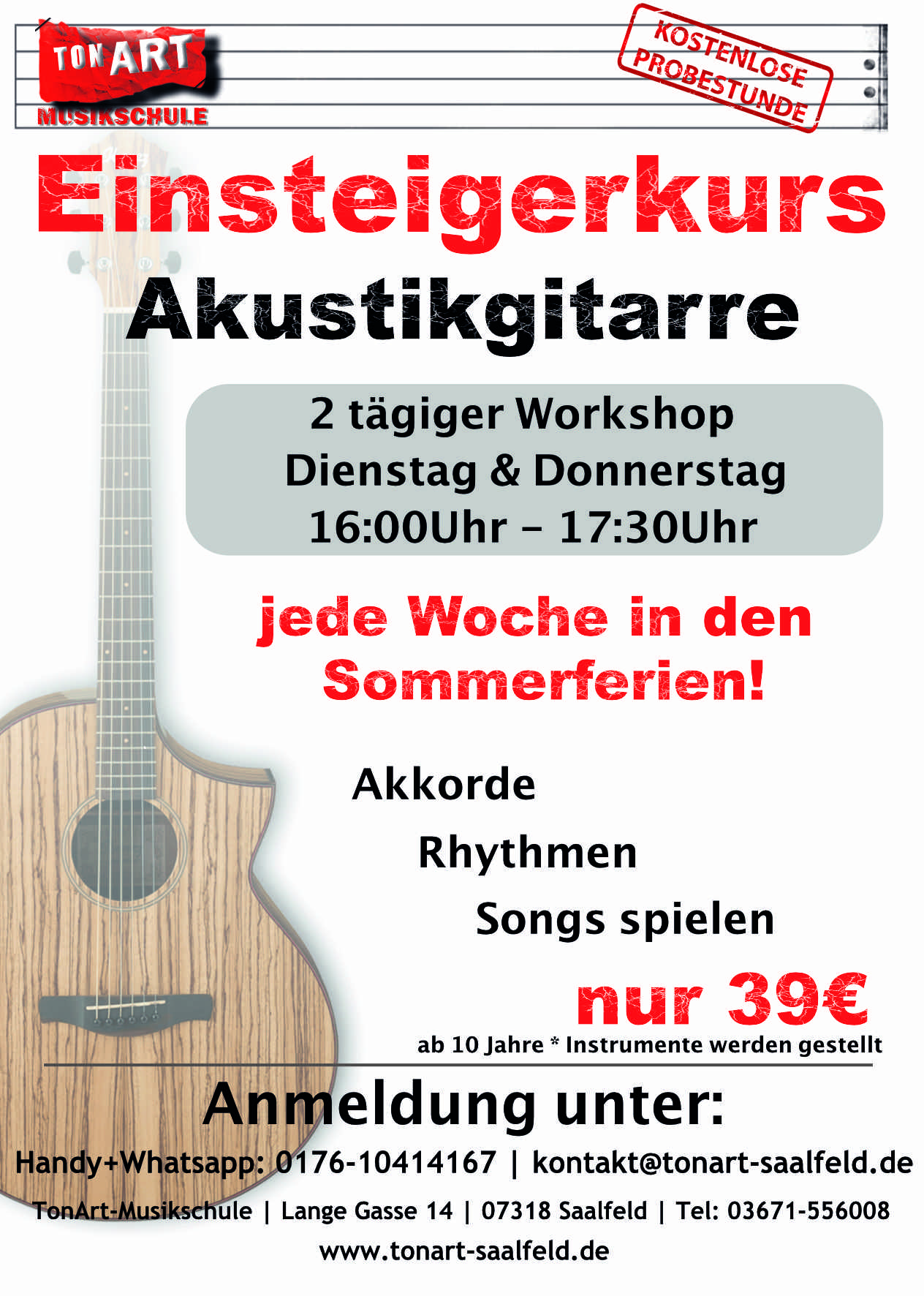In unseren 2 tägigen Workshops zeigen wir euch den leichten Einstieg in die Instrumente Gitarre oder Klavier. In kleinen Gruppen lernt ihr die ersten Schritte auf dem jeweiligen Instrument und begleitet schon die ersten Songs oder den eigenen Gesang.